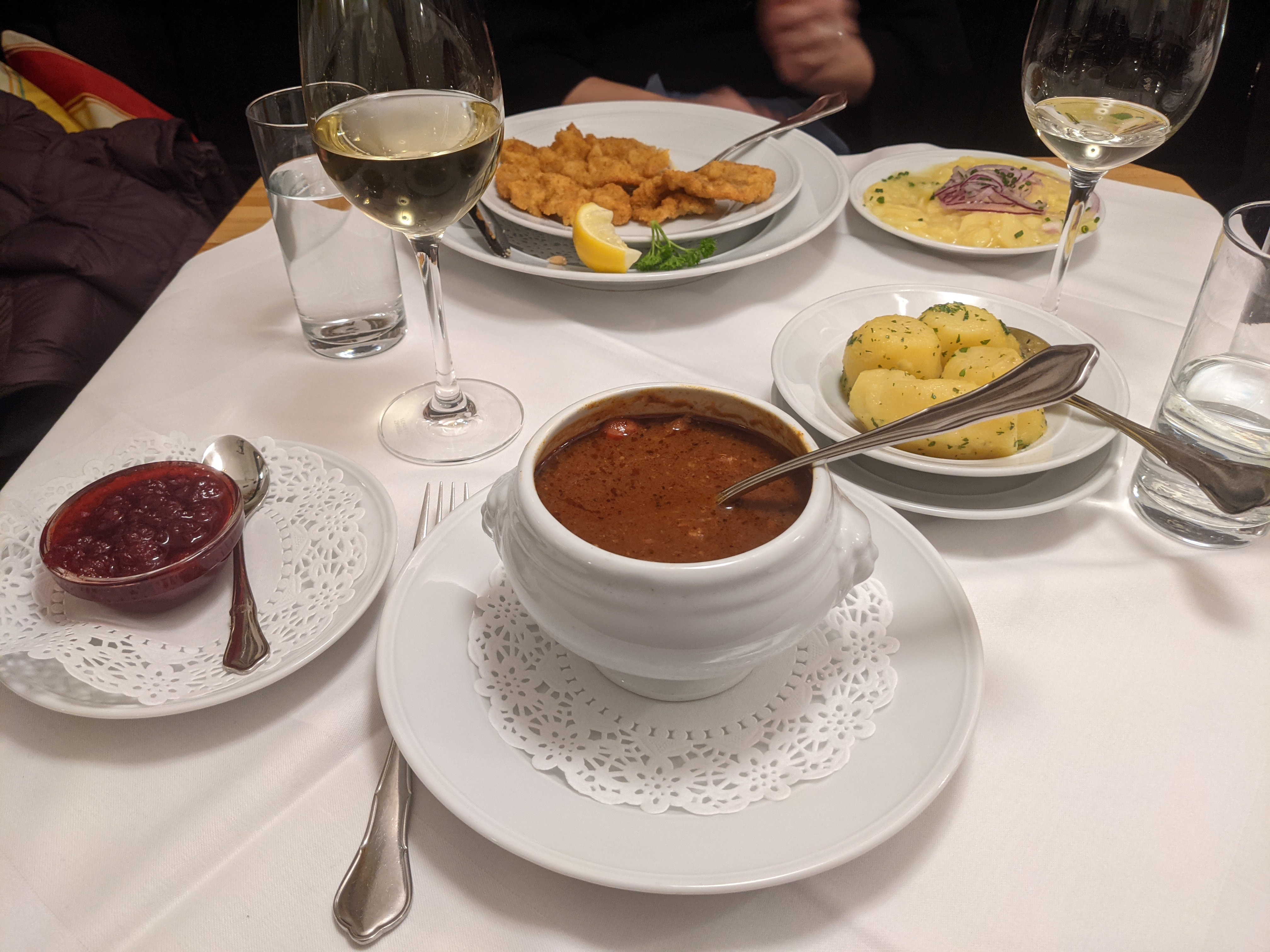 Parisian style cafes quickly became my favorite. We discovered the joy of prix fixe menus early on!One of Jamie’s very first pastries in ParisWho can resist a cocktail like this? When in Paris, right?Jamie’s favorite hot chocolate, Angelina’sParisian pastries on displayCheese shop in Le Marais district, Paris FranceButcher shop in Le Marais, any cut of meat you could imagineCheese plate for desert? Yes please! (with obligatory life-saving lactaid pill)Taking in the smells and tastes of our favorite cuisine, French!Pate and salad, Amboise FranceLoire Valley breakfast spread, thank you to our kind AirBnB hosts! We miss FranceLoire Valley wine cave filled with barrels, FranceExploring the gardens and sipping wine at Chateua de Valmer. Loire Valley, FranceI can never pass up a good Negroni, Athens GreeceGelato selections in Athens, GreeceSantorini sunsets are best paired with a glass of white wineFresh grilled Santorini octopus and saladDrinks overlooking the Caldera, Santorini GreeceMoussaka and the house red, transformative. Santorini, GreeceMedusa in Mandrakia serves melt-in-your-mouth smoked eel. Milos, Greece. One of the best individual bites of the trip.My go-to order for dinners, a half liter of wine. We need to adopt this in the US. Milos, GreeceM-Eating in Mykonos Greece was one of the best meals of the tripSeared crusted Tuna with carrot and vegetable compote, Mykonos GreeceItalian desert, truffle ice cream and a white RussianGluten free pesto pasta and prosciutto pizza, RomeLoving the gluten free options in Rome, goat cheese and prosciutto pizzaNot the best photo, but this mushroom risotto was fantastic. Rome, ItalyCarefully crafted deserts in Rome, ItalyCannoli and espresso, Italian breakfast. Naples, ItalyThis entire plate was gluten free! Yes, that is a pistachio cannoli. Florence, ItalyCharcuterie, red wine, grapes and figs in FlorenceWe ate this delicious Indian too fast for a before photo! Royal India in Florence, ItalyCan’t pass up a bottle of chianti when in Tuscany!The delicious home made Italian spread at a family wineryRiecine winery in Tuscany is a must visit, They have such beautiful chianti.You can’t visit Italy without trying Aperol and Campari SpritzesFell in love with Italian figs, Ripe and feshThe best fish market we’ve ever seen, Venice ItalyVenice had great choices of affordable cocktails, Aperol Spritz and Campari Sprit were some of our favoritesFruits and veggies for sale at the market in Venice, ItalyThese Salzburg potatoes were the best of the tip. Central Europe knows it’s meat and potatoesHigh end cocktails in Vienna, a mustPerfect Viennese pastries on displayGoulash, schnitzel and every type of potato imaginable! Vienna, AustriaVienna coffee culture, the best of the bestVienna offers endless pastries and delicacies, the sachertorte is a classic.Cute macarons and a glass of champagne, Cesky Krumlov, Czech RepublicMedieval Restaurant in Prague is divine, an absolute must visit. We got the melted camembert and arugula with the honey chili ribs each time. Don’t miss the honey wine!Duck confit, my favorite dish of the trip, Prague, Czech RepublicUrban House in Bratislava was delicious, the only tacos I had on the whole tripBudapest market, fruits on one side, chilis on the other. They take their chilis and paprika seriouslyWe discovered great spots to eat in BudapestWe found the most adorable café called Deryne. French onion soup in Budapest,Enjoying the sweet treats of Budapest, HungarySalmon roasting on cedar planks, our first Christmas market. Budapest, HungaryBaklava and salep tea, we loved the unique flavors of TurkeySlightly overwhelmed by this Village Breakfast from Privato Cafe, which ended up being our Thanksgiving meal!. Istanbul, TurkeyThis was only one course of our Turkish “Thanksgiving” feast. We didn’t eat any actual turkey in Istanbul though…More Turkish delights then you could ever imagine! IstanbulLovely fruit stand near Glata Tower, Istanbul TurkeyMunich offered fresh fruit, even when it was snowingInsane presentation and the freshest seafood, Octopus in Ghent BelgiumL’as Du Fallafel, a Parisian institution for street food. Paris, FranceNo walk down the Champs Elysee is complete without a stop for some macarons from Laduree. Paris, FranceBurgandy escargots and French onion soup from Le Procope, the oldest café in ParisParis France, assembled this breakfast spread for Jamie and I, everything bought nearby