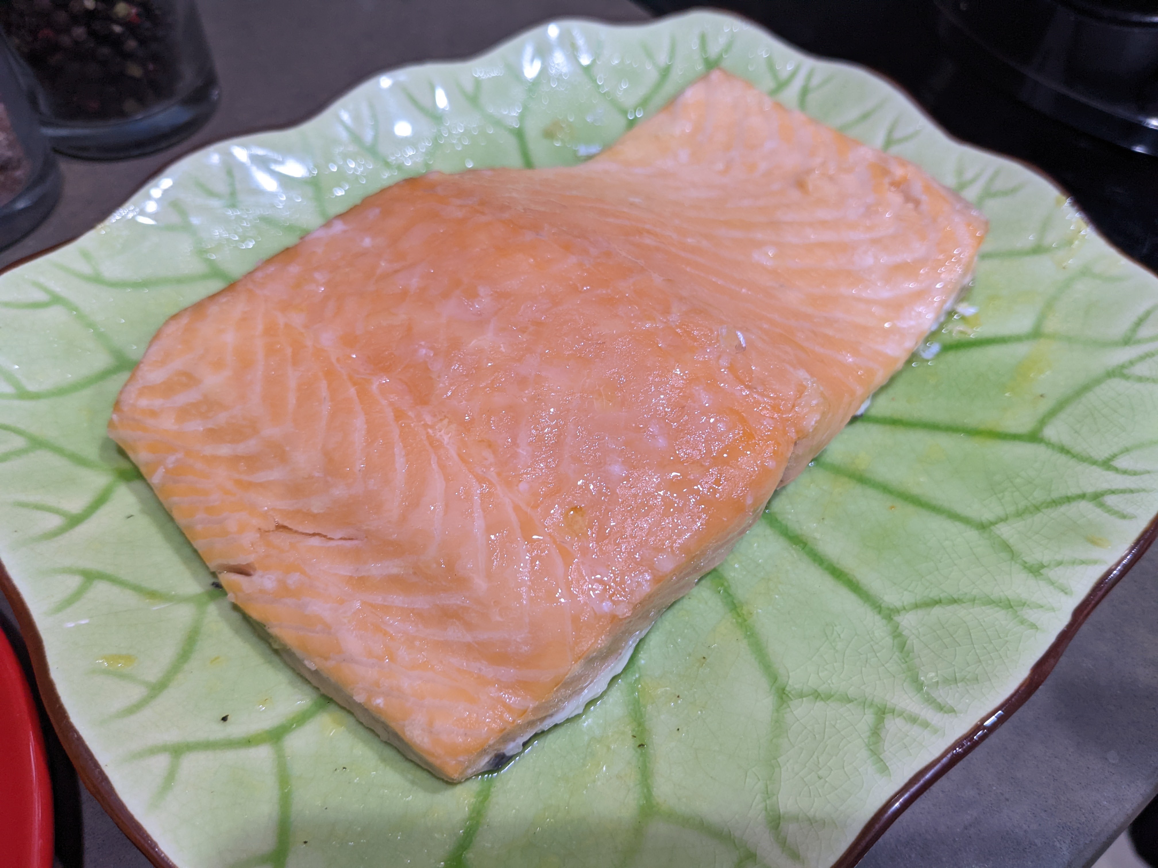 - Coat Salmon in Olive Oil, add Salt and Pepper